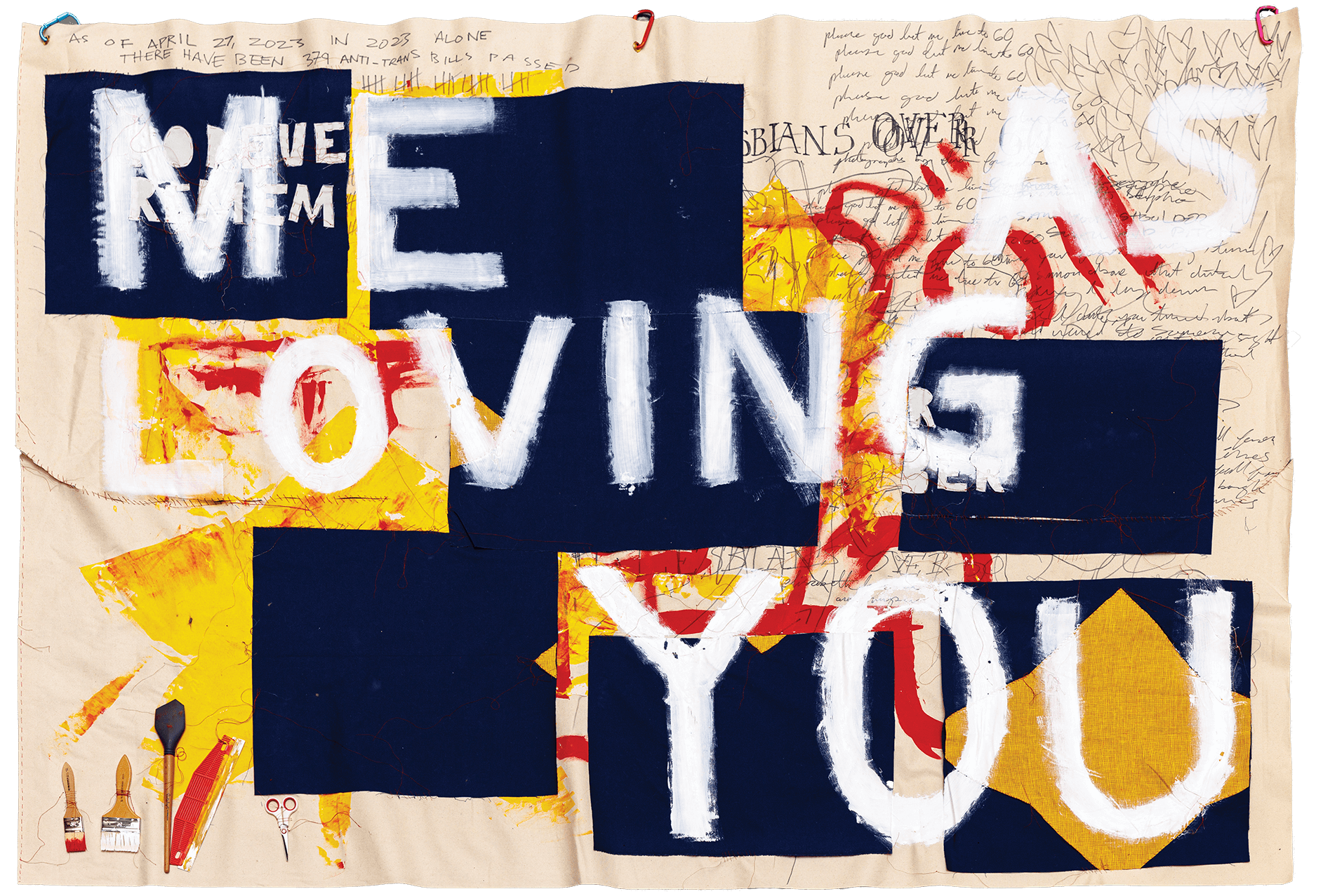 a commission for the local cancer research center's diversity and inclusion board. they chose me to represent the queer community of my city, leaving me pretty much free reign to create whatever i felt like for it. this was the finished product. it's 9 feet wide and 7 feet tall and i hand-sewed and painted it on the floor of my apartment over the span of 3 months. if you zoom in you'll notice that i also gave it top surgery, and stitched the tools i used to make it into the piece itself. i found it symbolically important to not trim or cut away any material-- all the thread seen is the thread i allotted for it, which is what gives it its sort of unkempt look. the basis of the piece is a partial recreation of block #3249 of the aids quilt, which, like my piece, includes the words "forever remember me as loving you." under the sewn-on fragments of the block recreation are statistics about anti-trans legislation, healthcare and lifespan facts, hidden anecdotes from my own life as a trans woman, prayers and beggings for the ability to live to see 60, and fragments of poetry written by sapphos.