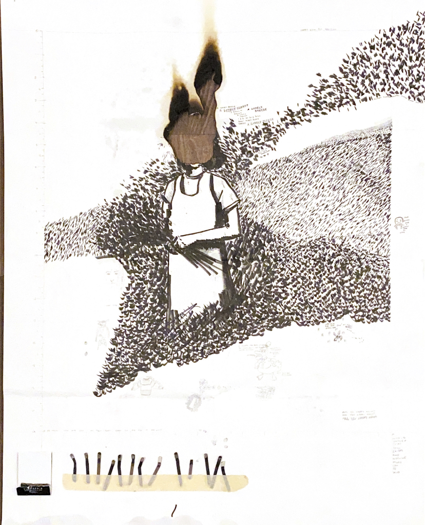 this doesn't really show the marginalia all over the piece but the whole thing is sort of a pained manifestation piece. a last-ditch effort at creating art immediately before i started transitioning. i drew a picture of me, as i wanted to be, in a field of flowers with wind blowing, then burned my face off. i attached the matches i used for the burning to the bottom of the work itself. after i declared it as a finished work and presented it to the class that i made it for, i burned the piece in its entirety.