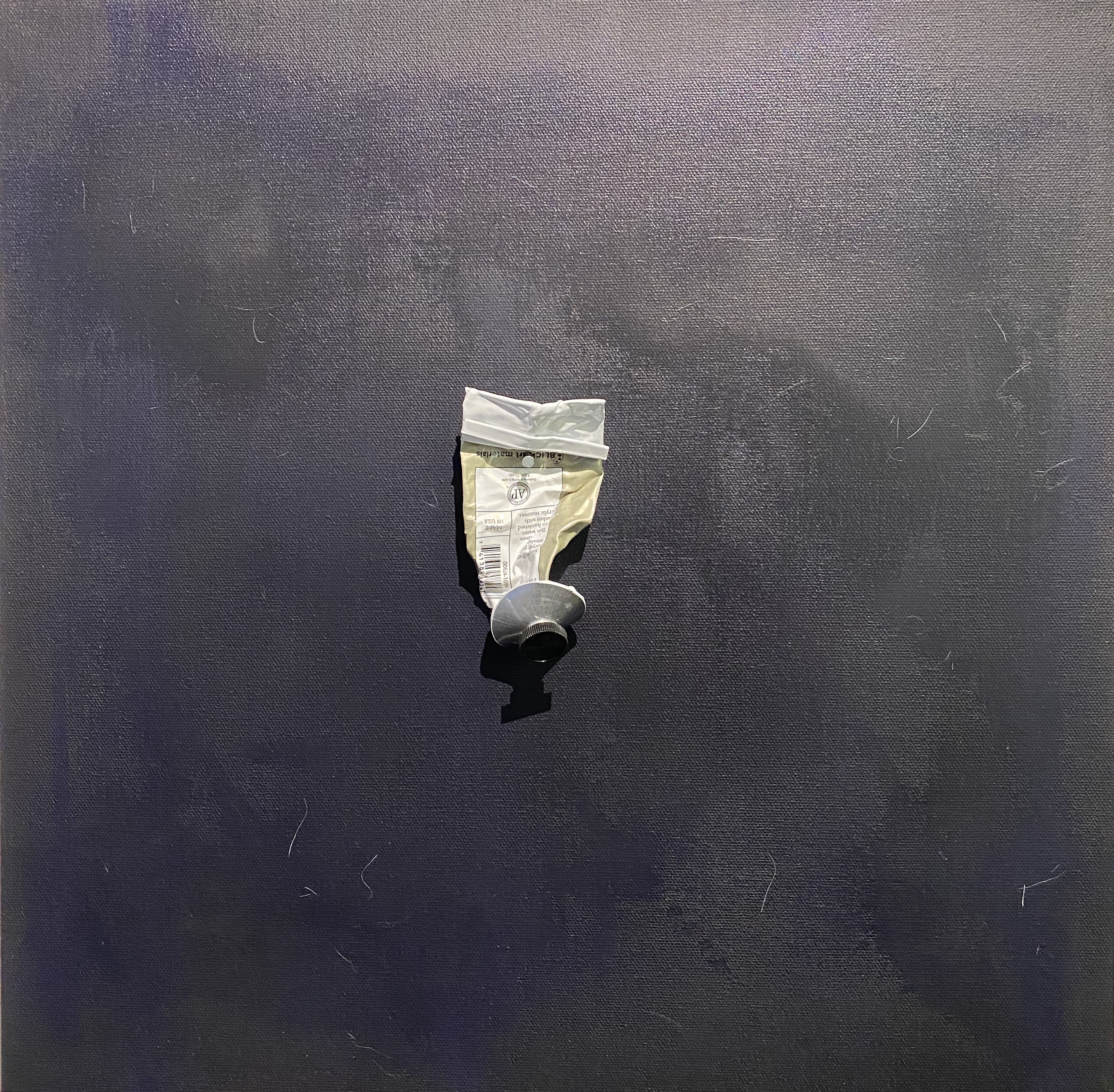an incredibly personal piece depicting a tube of paint nailed violently to a canvas coated completely in the entire tube that was then nailed to it. a reflection on the exhaustion one feels after a traumatically violating event.